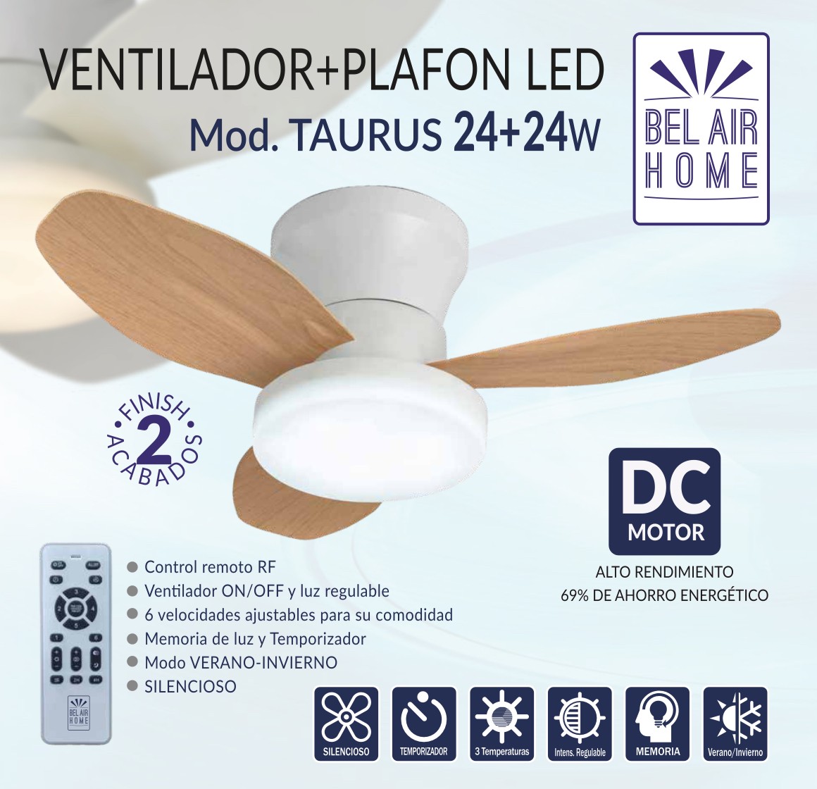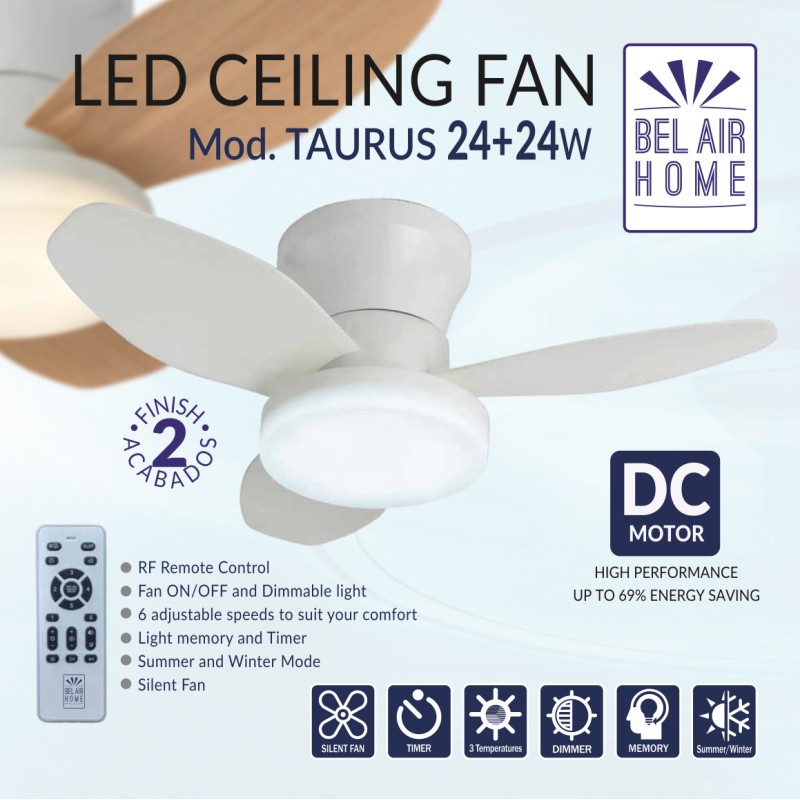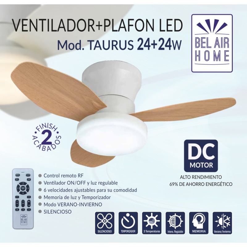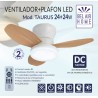 Ventilador de Techo TAURO con Motor DC y Luz LED 24W, 6 Velocidades de Aire y 3 Temperaturas de Luz, Mando a Distancia Incluido