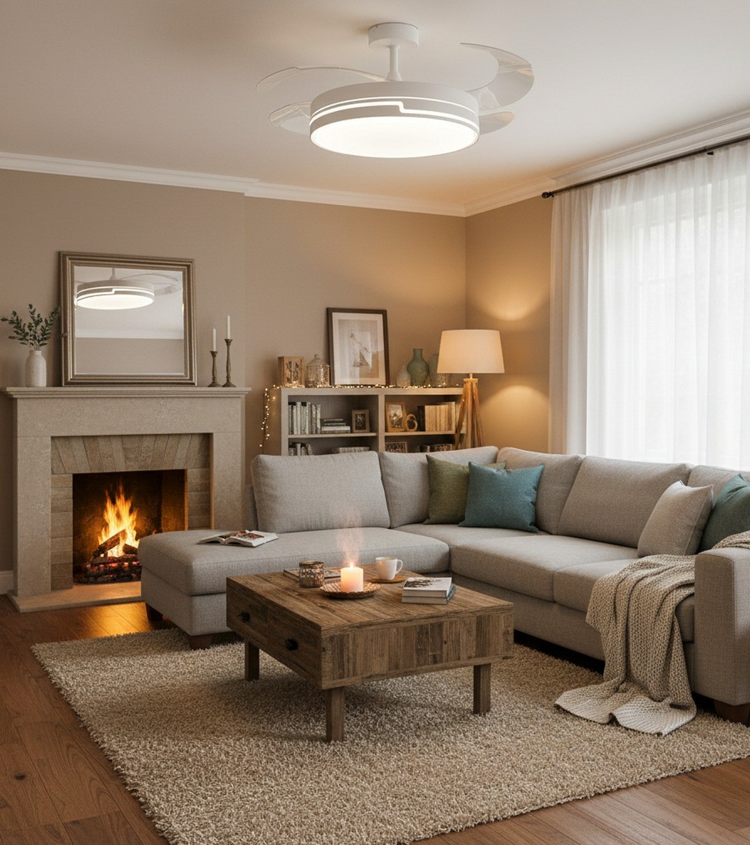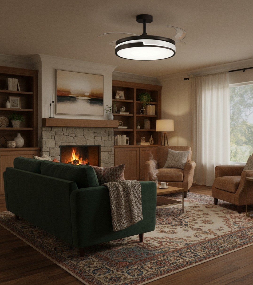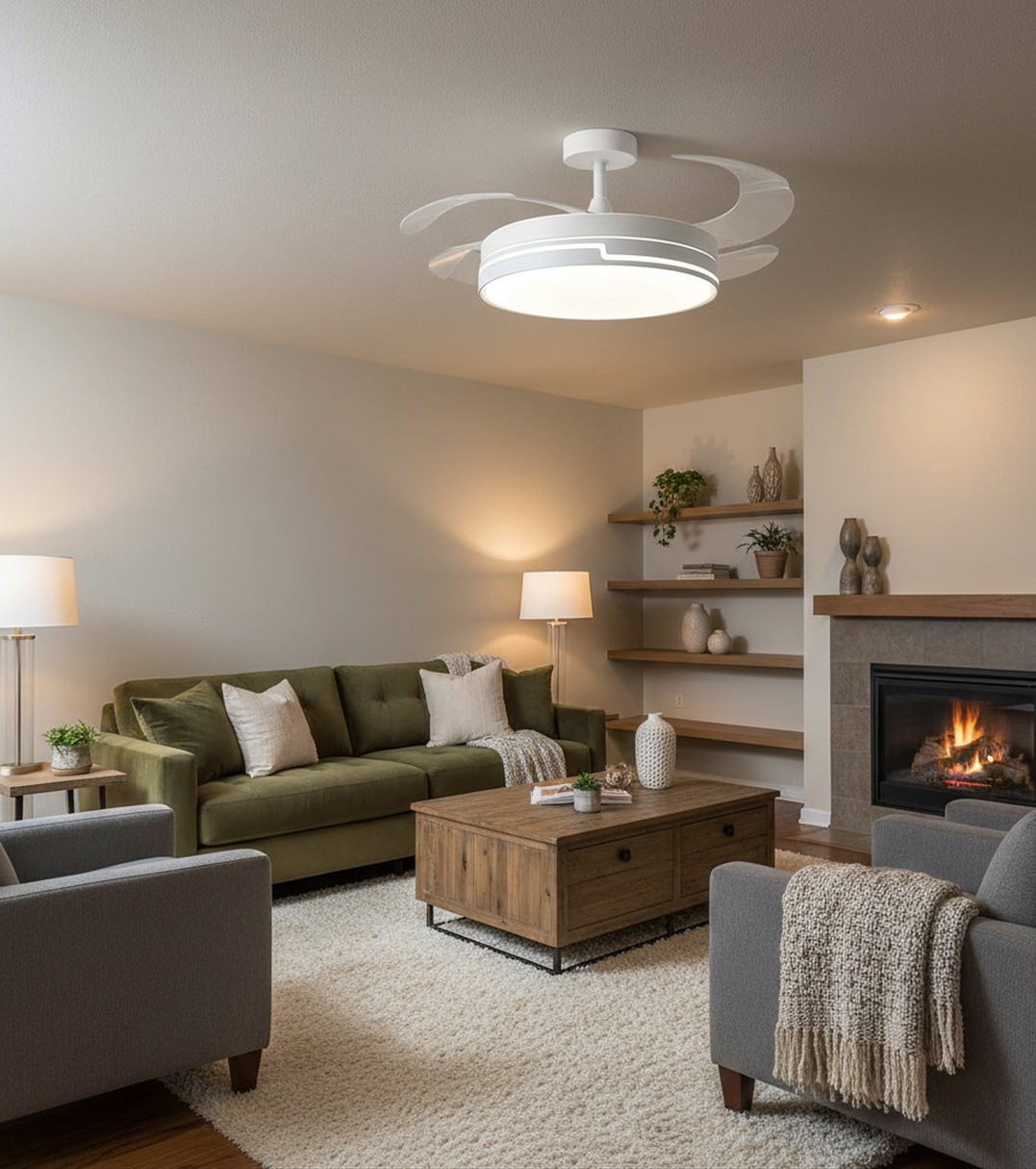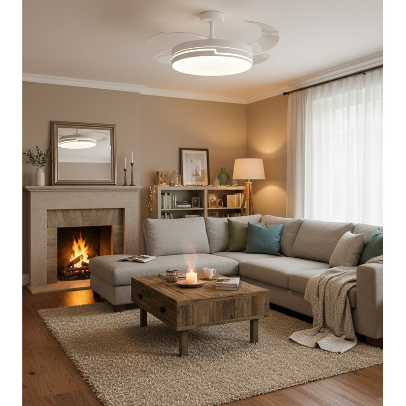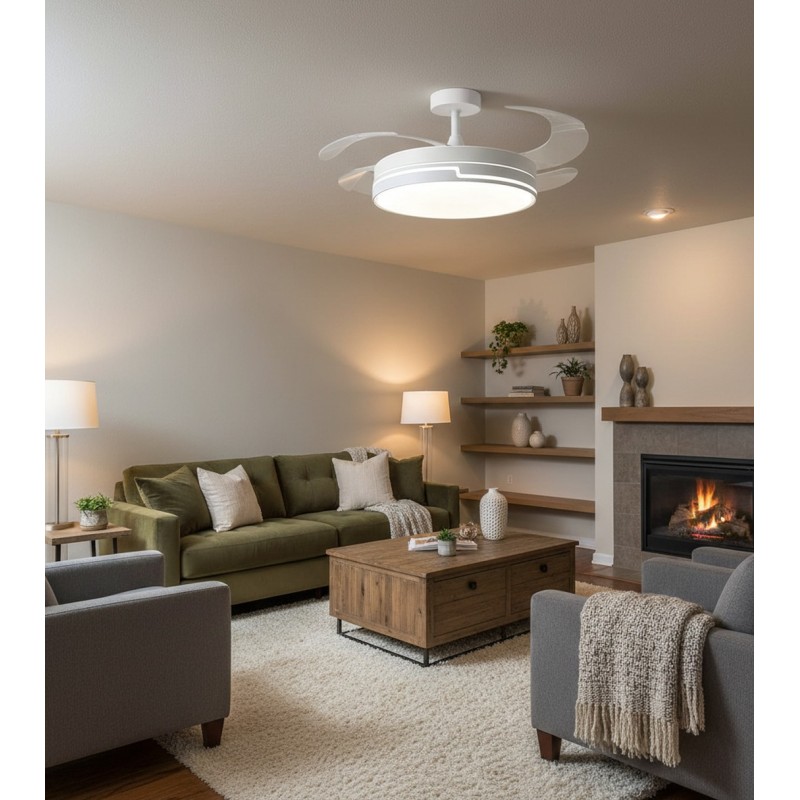 Aspas desplegables y diseño moderno: Este ventilador de techo cuenta con aspas desplegables que se ocultan cuando no están en uso, ofreciendo un diseño elegante y minimalista en color blanco que se adapta a cualquier estilo de decoración.