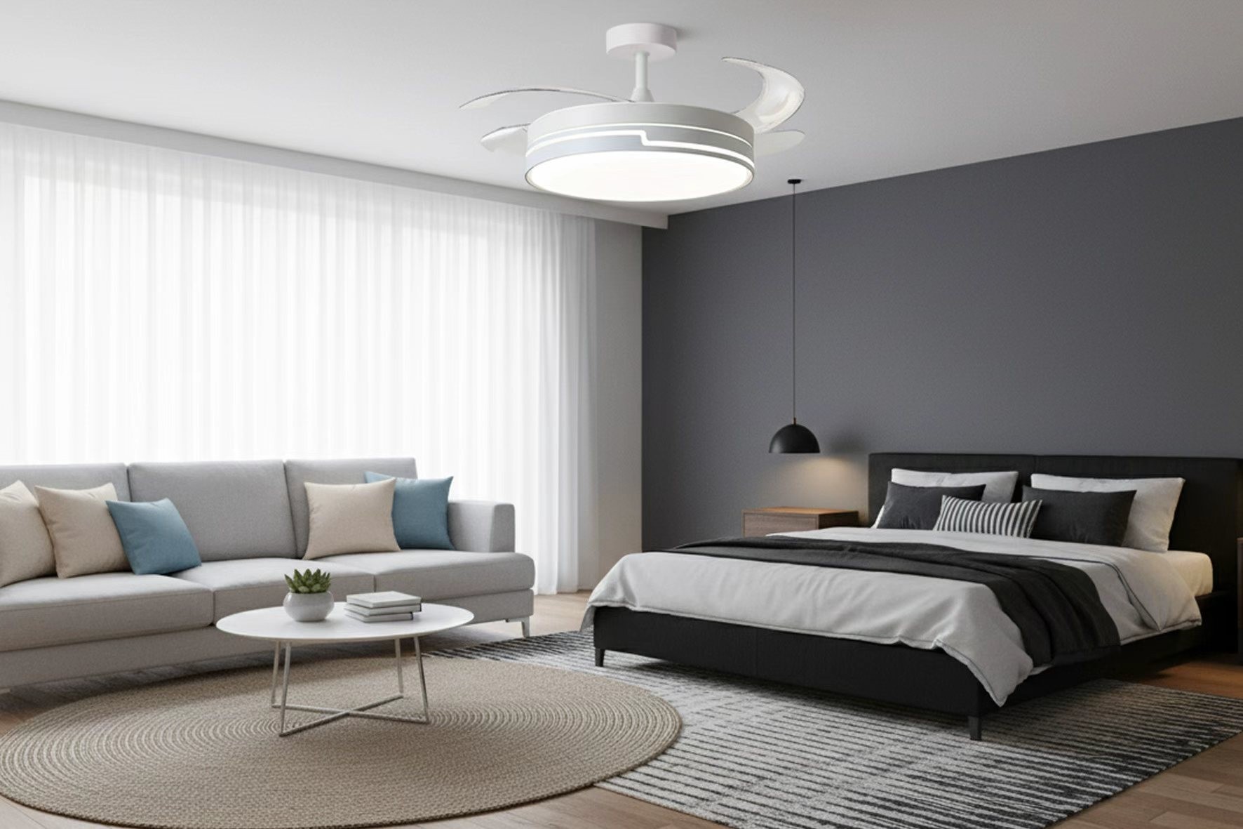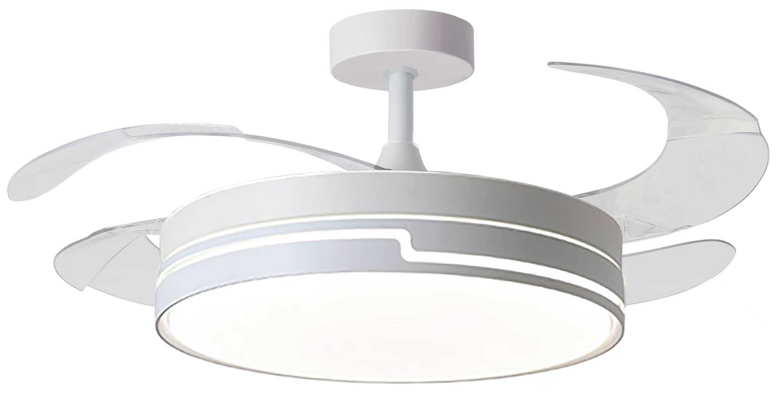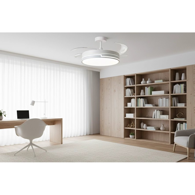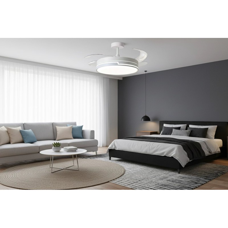 Aspas desplegables y diseño moderno: Este ventilador de techo cuenta con aspas desplegables que se ocultan cuando no están en uso, ofreciendo un diseño elegante y minimalista en color blanco que se adapta a cualquier estilo de decoración.